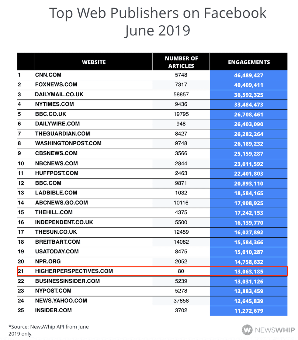 For example, RebelMouse-powered Higher Perspectives ranked in the top 25 publishers on Facebook in June 2019 with just 80 articles published, according to NewsWhip: