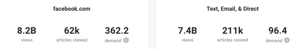 Data from the social listening tool Parse.ly found that referral traffic was roughly the same between Facebook and direct traffic sources. Direct traffic is acquired through communication methods such as text messages and email. While direct traffic can prompt users to view a wider range of content, like in an email marketing campaign, Facebook referrals usually come from one single article.