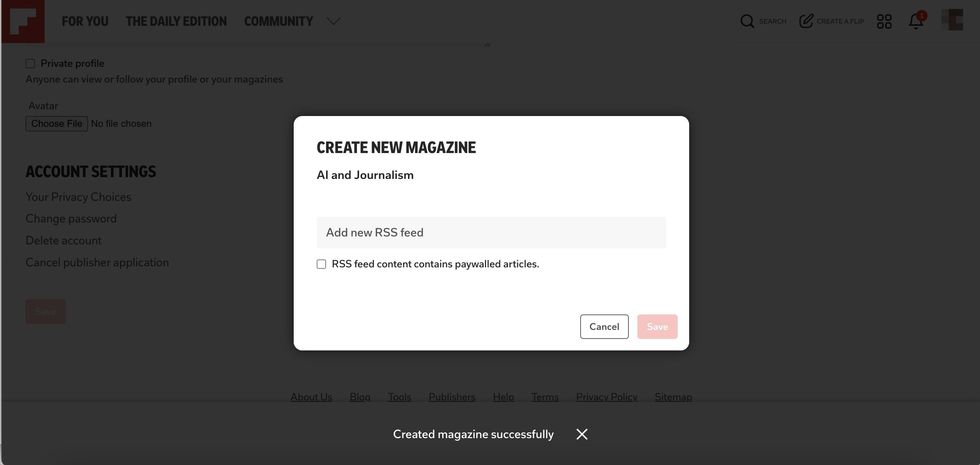 To manage your magazines, go to your publisher profile, hover over the magazine, and click Edit. Here is where you can change its name, add a description, make the magazine private (so you can curate before you push it live), change the cover image, and add or remove RSS Feeds.