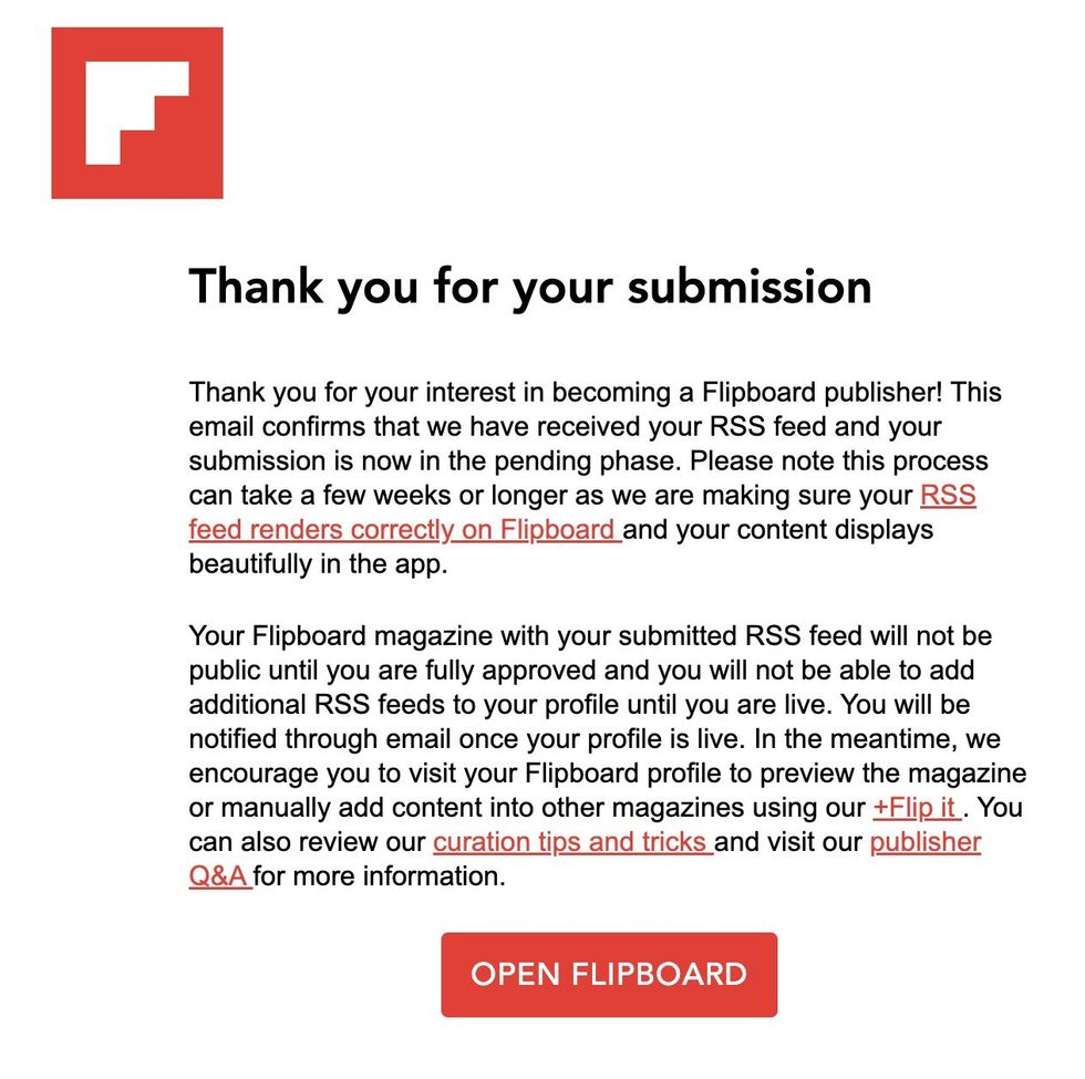 You can find your RebelMouse RSS Feed by following the instructions in this post. After you have submitted your RSS Feed, Flipboard's team will review your submission.