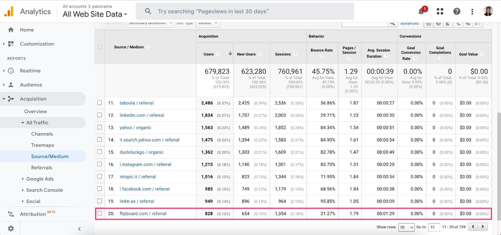To monitor your traffic from Flipboard, log in to Google Analytics 3 (Universal Analytics), and click the Acquisition drop-down menu. Then, select All Traffic. Finally, select Source/Medium.