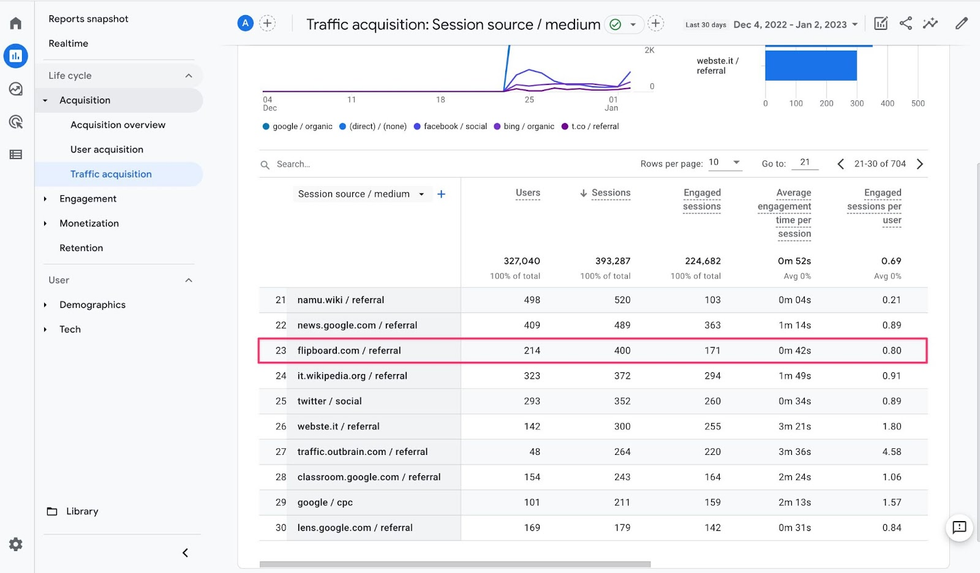 In Google Analytics 4, click Reports. Then, select Acquisition, and then Traffic Acquisition. Finally, scroll down to the table and filter by “Session Source/Medium.”