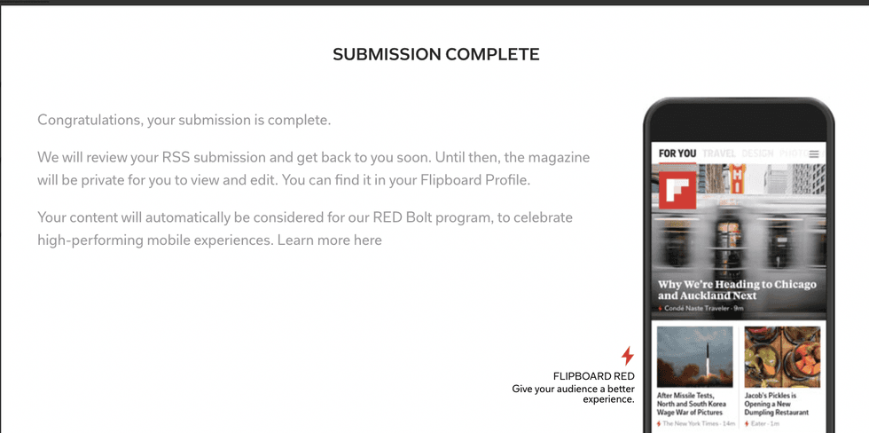 The Reader Enhanced Display (RED) Bolt is awarded to publishers on Flipboard who are using mobile web designs and standards that create a better experience for viewing content on the web. The RED Bolt will display within the Flipboard mobile app next to a publisher's articles and is used to indicate to users that the article they are about to open will load quickly and be free of intrusive ads that diminish the user's experience. For more information on the RED Bolt and how to be a part of the program, click here.