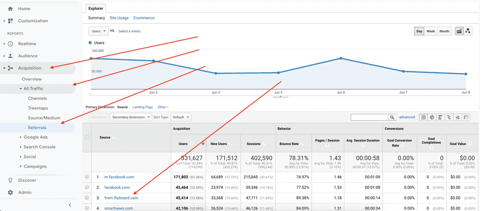 To monitor your traffic from Flipboard, log in to Google Analytics 3 (Universal Analytics), and click the Acquisition drop-down menu. Then, select All Traffic. Finally, select Source/Medium.