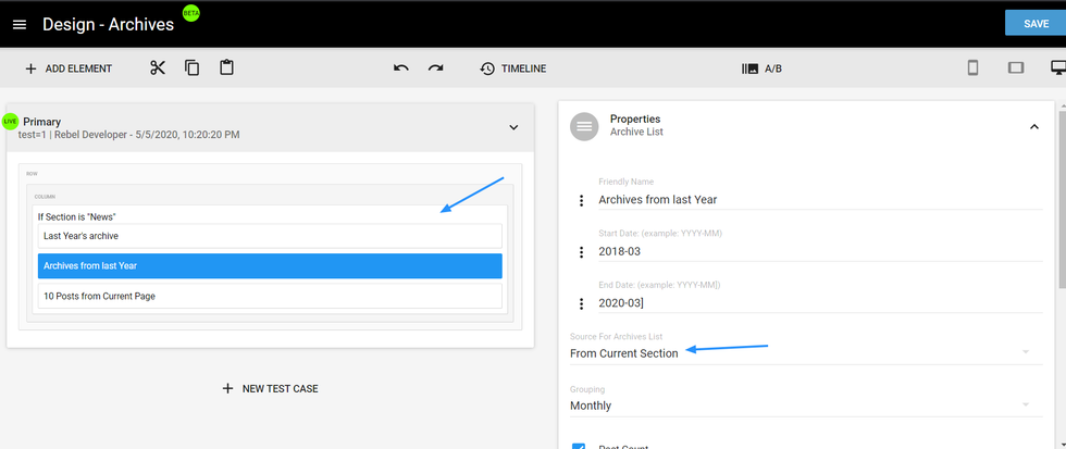 If you would like to see Archives on a section page, you need to add a Conditional element in Layout & Design Tool. Then, set the Source as Current Section.
