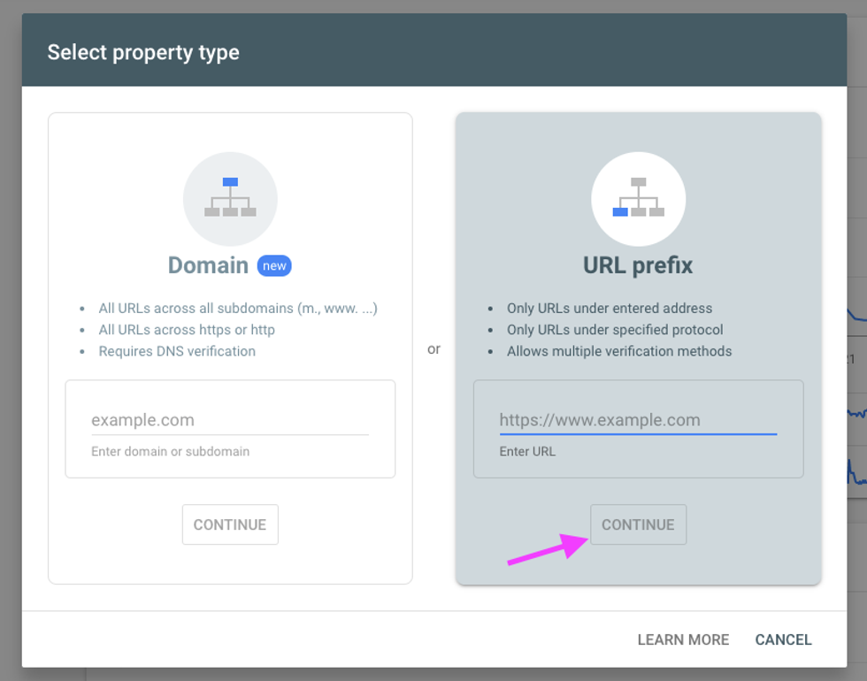 Select URL prefix and copy-paste your website's URL in the text field. Then, click Continue.