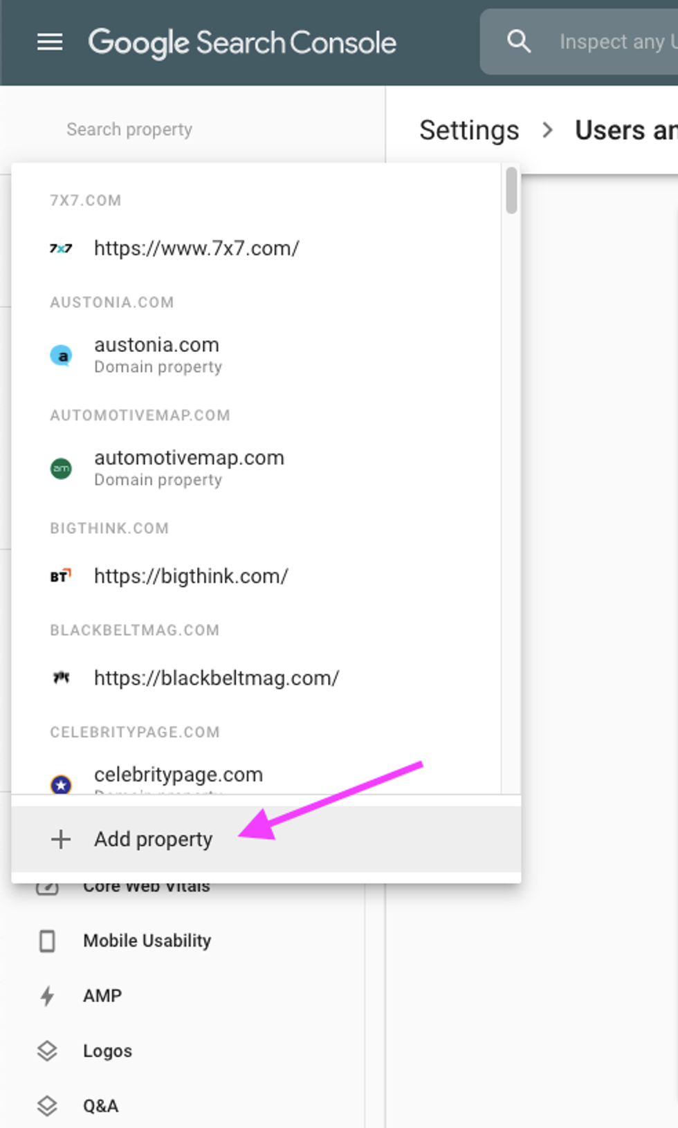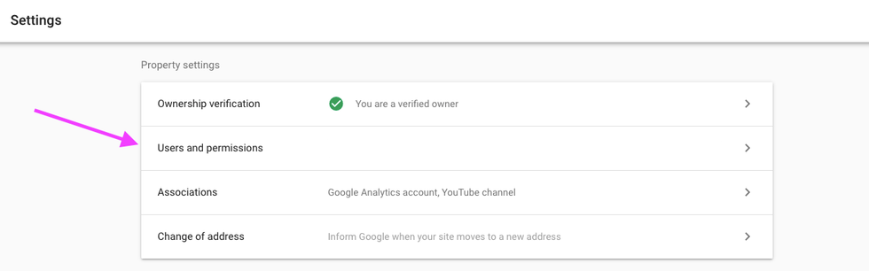 If you want to add a new user to your Google Search Console to have them help you manage your website, scroll down in the left-hand sidebar and click on Settings.