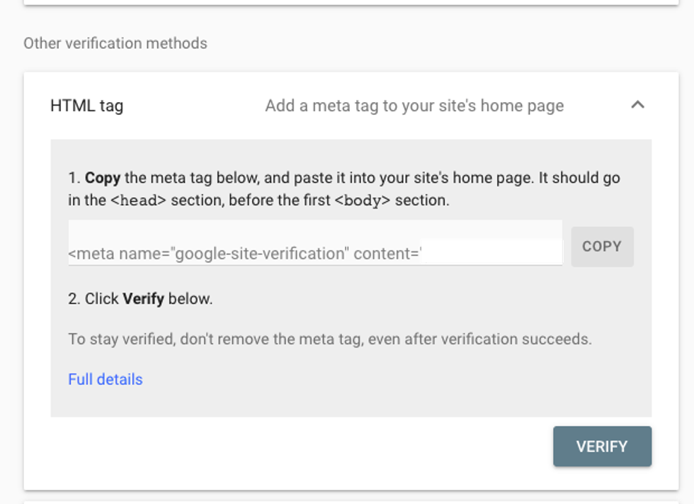 Select the option HTML tag and click Copy to copy the code. This code will be added to your RebelMouse website in the following steps, but please keep this Google Search Console page open because we'll be coming back to it shortly to finalize the process.