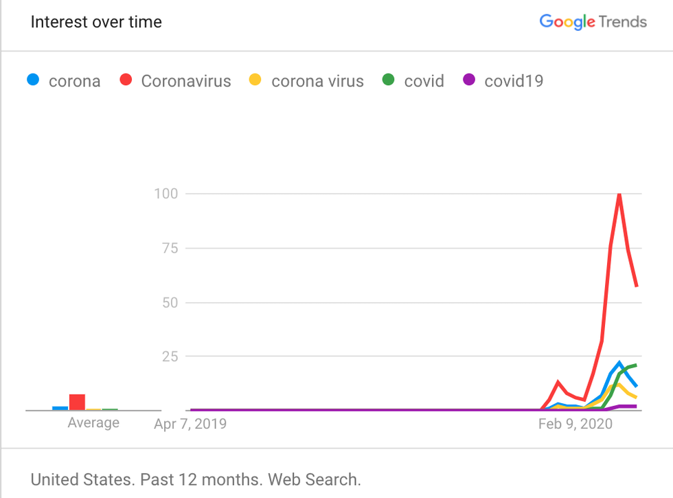 According to the data, "Coronavirus" is the most popular search term, but "covid" is picking up steam. This means it could be a strategic choice to start targeting the word "COVID" in your search strategy to get ahead of the trend.