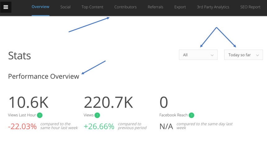 - The Stats Dashboard's aim is to get you the most efficient birds eye view on your site and the overall performance of all of your content.