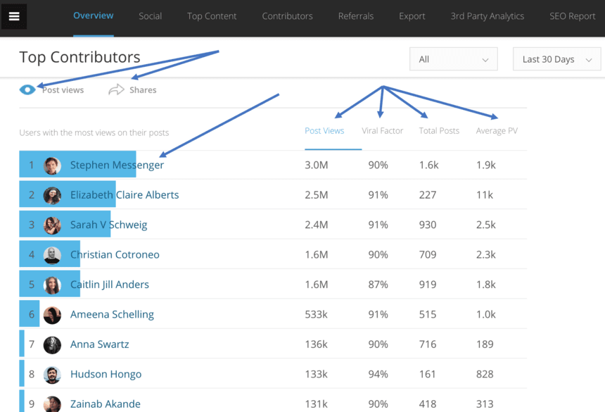 - By default the table is organised by Post views but you can check Viral Factor - same as viral views in Top Posts - the Total number of posts that author has generated and Average Pageviews generated by those posts.
