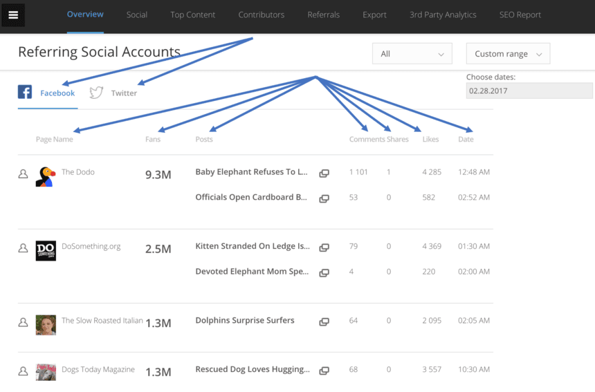 - For Facebook, you can check the name of the page, the number of fans, the social media post itself, the number of comments, shares and likes, and the date when the post was published on that channels.