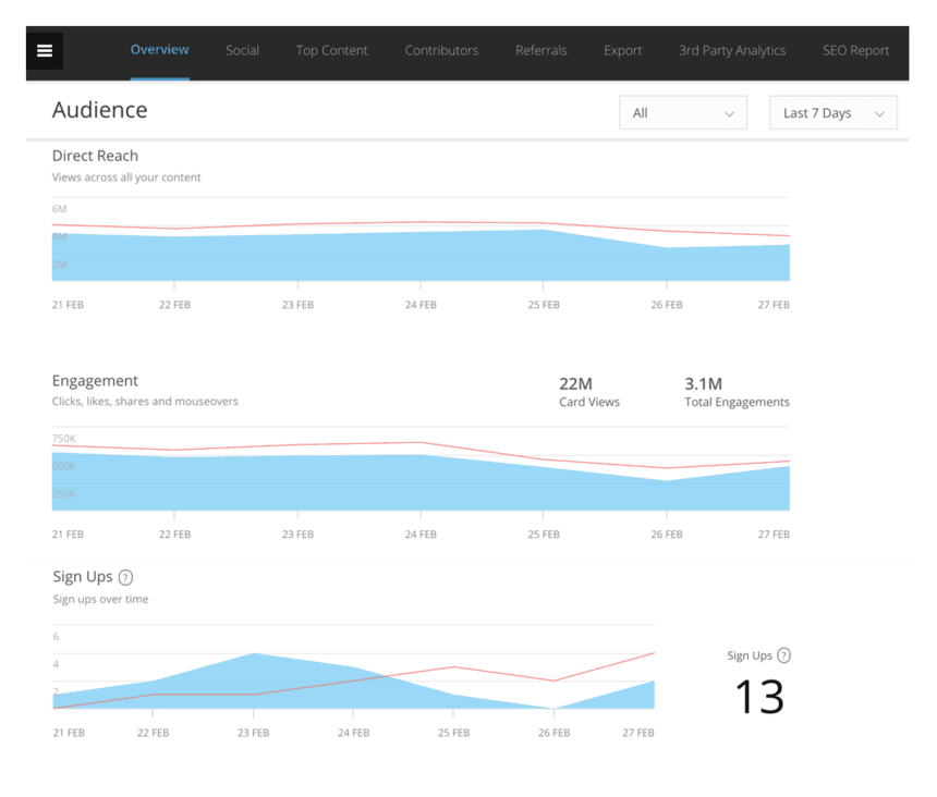 RebelMouse offers a robust analytics to measure the performance of your distributed content, your editorial team and your site. Our Stats Dashboard feature retrospective data and insights in a visual straight-forward way so everyone can get out as much insights as they want, regardless their statistical knowledge. Our Stats Dashboard is also interactive so you can change what you see according to your main point of interest.