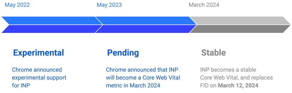 The Google Chrome team then designated INP as a pending metric in 2023, and announced that it would advance to stable status in March 2024.