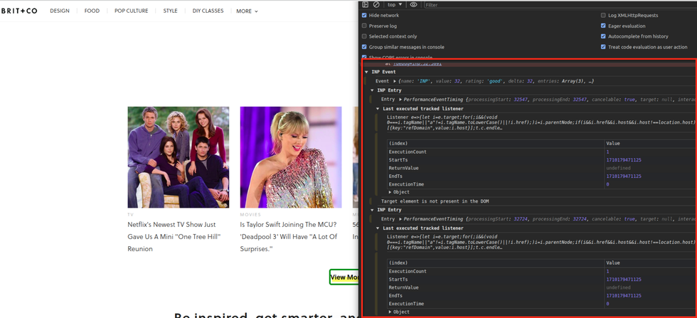 Identifies Problems: This ability to intercept listeners allows us to measure the execution time of the listeners, determine their quantity, and pinpoint their locations within the page's code. By doing so, we can identify problematic listeners that contribute to a site’s Input Delay (ID) score. Input Delay is a metric used to measure the responsiveness of a web page to a user’s interactions. It specifically refers to the delay between when a user performs an action on a web page, like clicking a button, and how long it takes the page to respond to that click. Our debugger will find these issues and display them in your browser's developer tools for debugging.