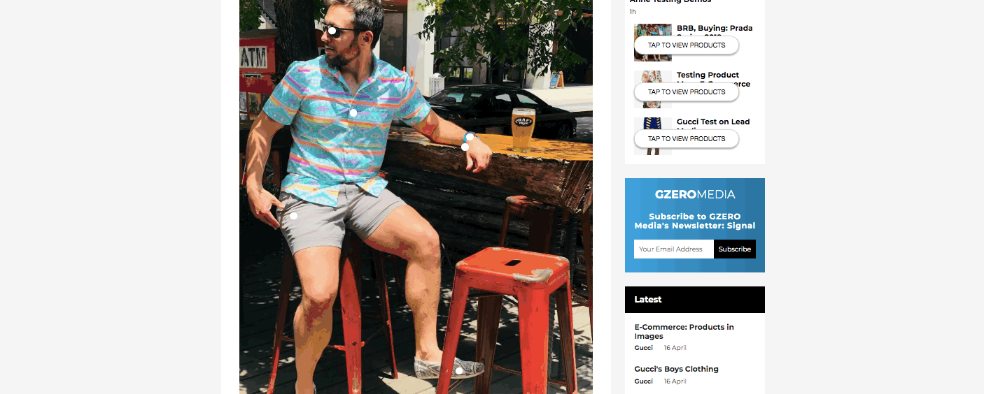 As part of RebelMouse's enterprise e-commerce solution, we have a feature that resembles the product-browsing experience you can find on Instagram. In their app, interactive dots lay over images that, when clicked, expand to show a product's image, title, price, and link out to buy it: