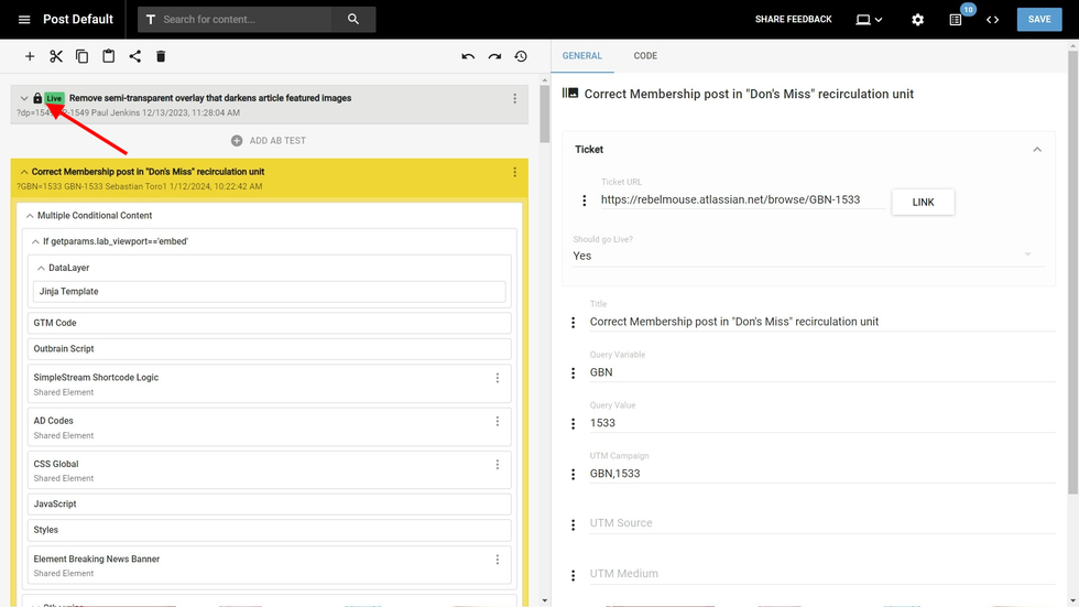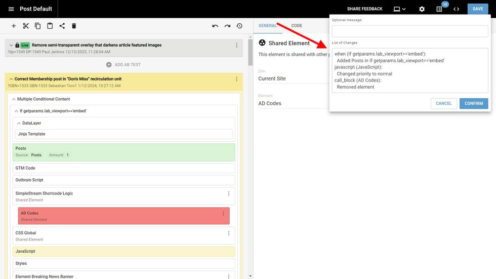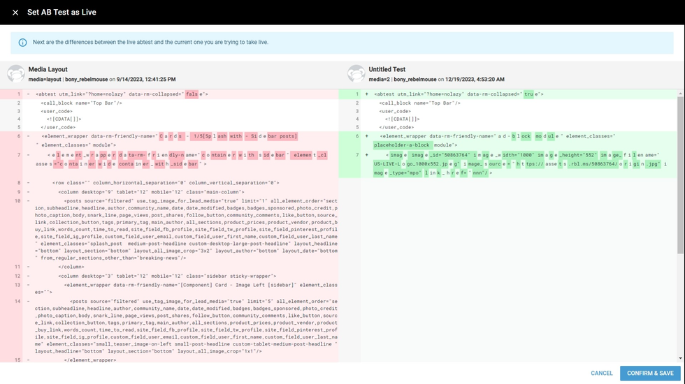 Every time you push an A/B test live, a comparison screen will appear that shows the differences between your A/B test and the one that is currently live. This means that you will no longer overwrite live changes that you were not aware were introduced.