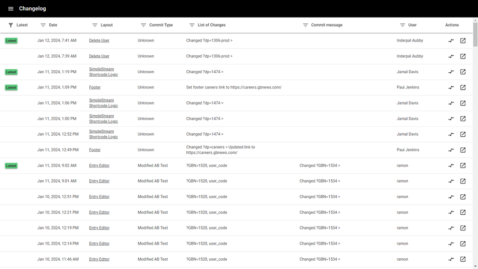 Changelog will track the creation and deletion of custom pages or custom shared elements, as well as the creation and deletion of A/B tests. Also, it will register any A/B tests set as live and whenever they are archived or unarchived.