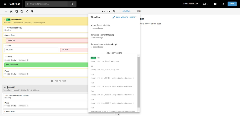 Instead of tracking all actions, Timeline will now only register actions that make actual changes to the current page, and will no longer track consecutive changes of the same type that overwrite each other. This will make the change history shorter and more meaningful. You will no longer see selection, expanding, or collapsing actions, nor repetitive entries.