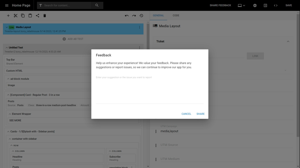 Use the "share feedback" button in Layout & Design Tool's top bar to tell us what you would like us to improve, or if you encounter any issues.