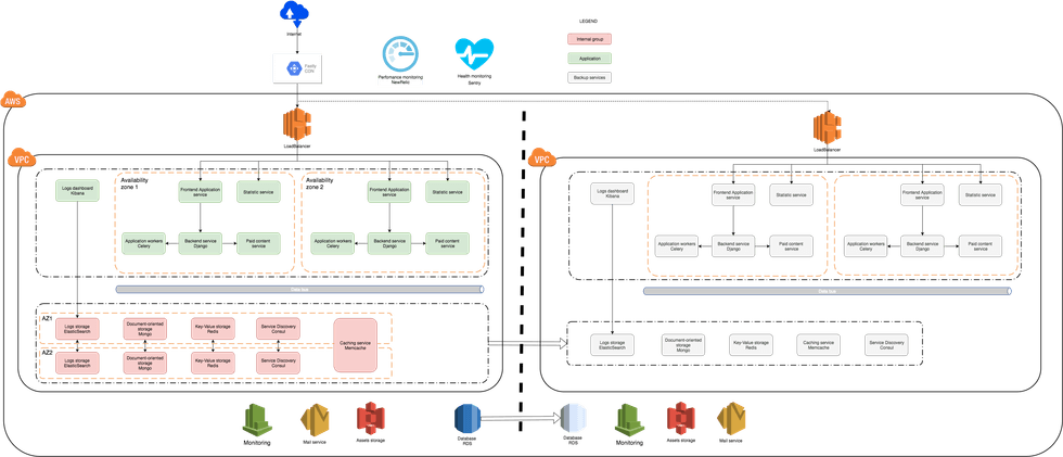Load balancing and Elastic Compute Cloud (EC2) instances provide monitoring services with resource consumption data. Stateful services such as MongoDB, Redis, and Memcached are deployed within a VPC into multiple availability zones using Auto Scaling groups. Every data service has backup, recovery, and automatic failover procedures. Backup and recovery procedures are integrated into Auto Scaling groups and tested regularly.