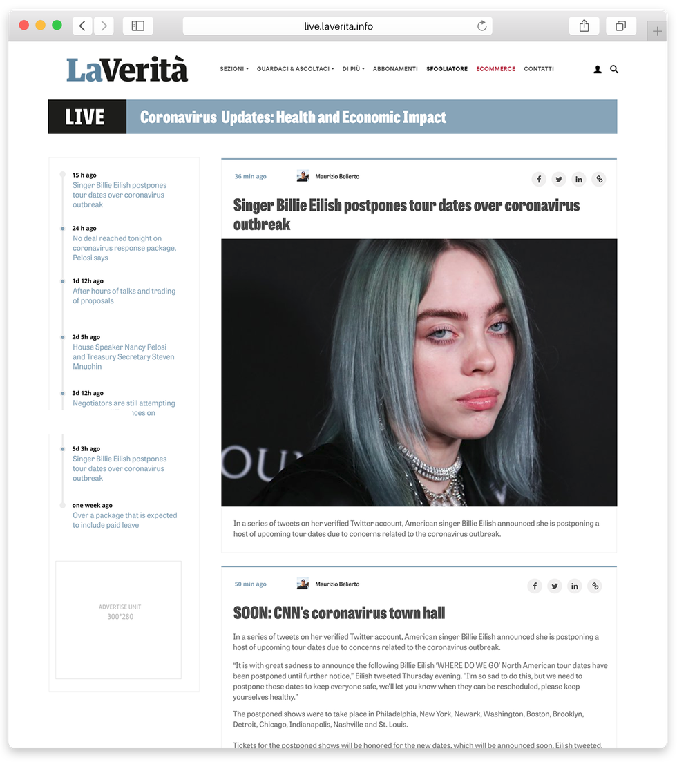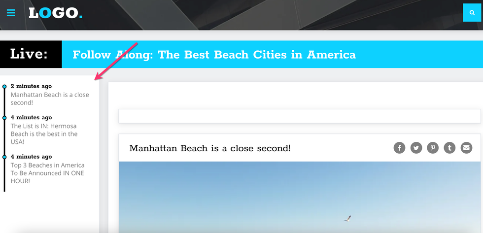 Each particle you add to your live post will have a timestamp of when it was published to show readers the timeline of your story and the most recent information. These timestamps will be reflected in the live post on your site. Your particle headlines and when they were published will be featured as clickable links in a sidebar next to your post.