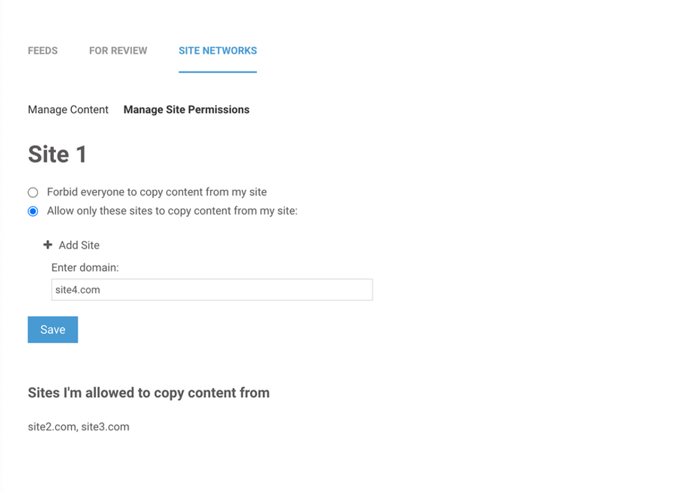 - Enable other sites to copy content from your site by selecting "Allow only these sites to copy content from my site." Add the domains one by one and click Save.
