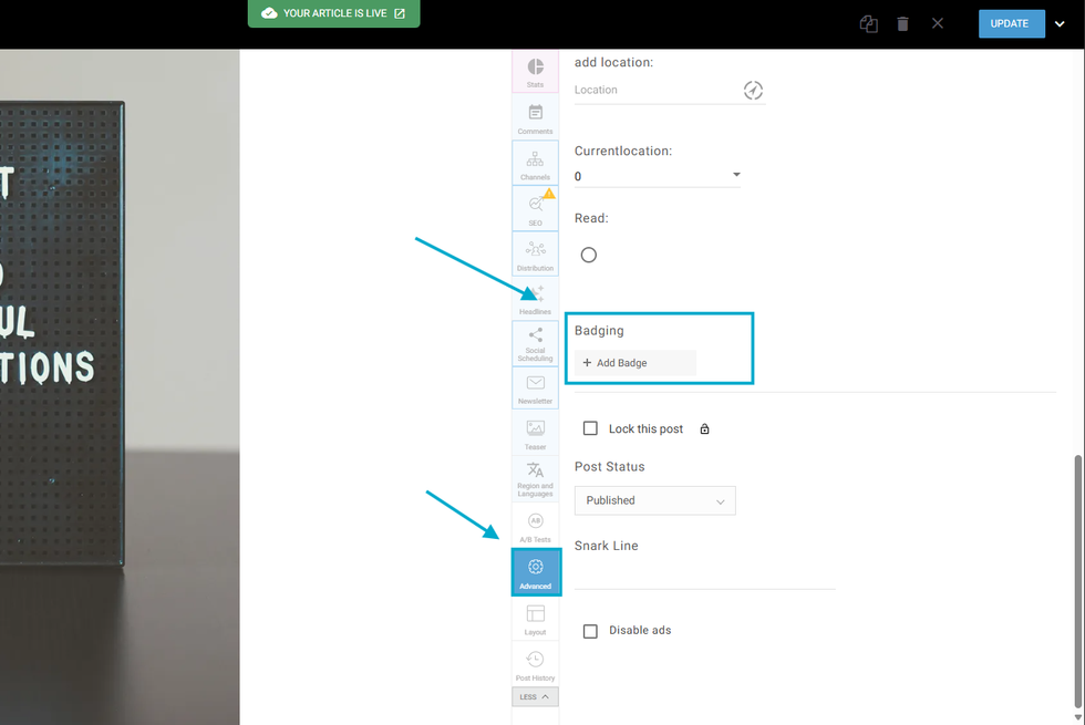 For badges to appear, you must assign them to posts in the Entry Editor while creating the content. If you haven’t done this yet, don’t worry — you can still edit older posts to add badges. To assign a badge, go to the Advanced tab in the right-hand navigation menu of the Entry Editor. Look for the gear icon, then find the Badging field.