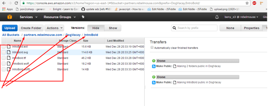 Log in to your Amazon S3 account, select or create an appropiate folder (anything you want to keep it tidy) and then upload the font files.