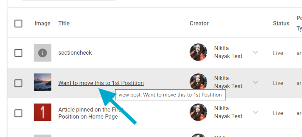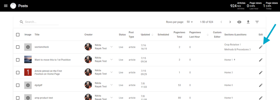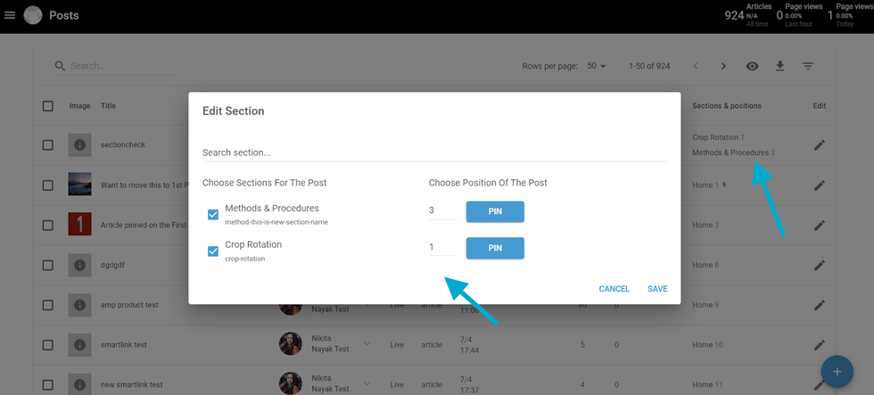 From the post dashboard, you can pin a position for an article or add, edit, and delete a section from an article.Note: If you have pinned an article to a specific position, no other article can be pinned to that same position. To pin a different article to the same position, you must first unpin the existing article and then pin the new one.