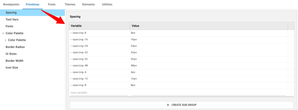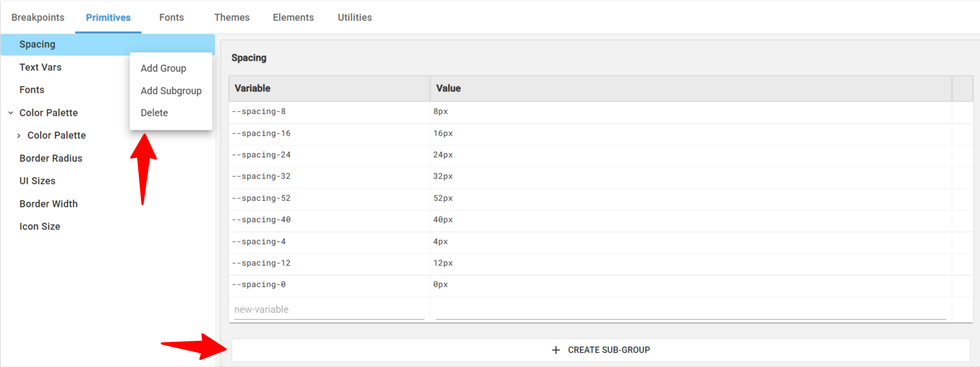 Primitives tab is where you can add design variables and values such as colors, spacing, typography etc.