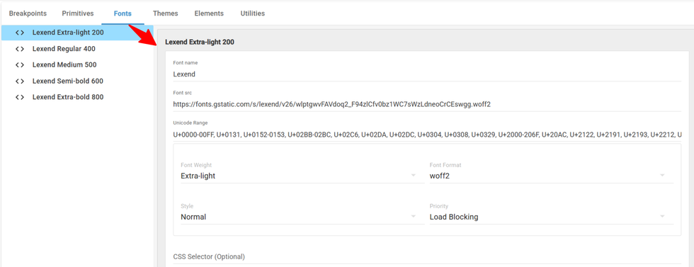 Font Priority: Choose whether the font loads in an optimized (lazy load) or load-blocking.