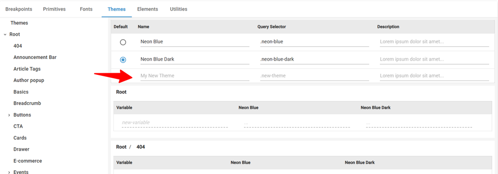 Each theme is displayed in vertical columns, allowing you to easily select different values for each variable. For example, in the screenshot below, the Neon Blue and Neon Blue Dark themes appear side by side so you can assign separate values for the same variable across themes.
