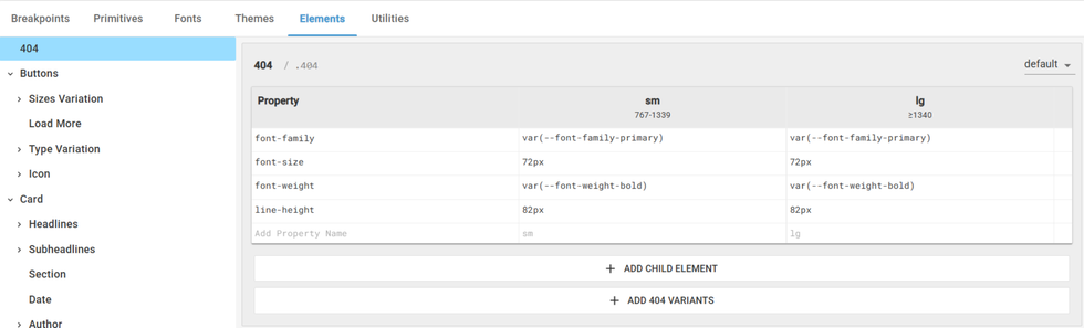 Elements tab is where users will define the elements and their variations used in the design. Add and manage design elements, including child elements, variants, classes, and their respective properties.