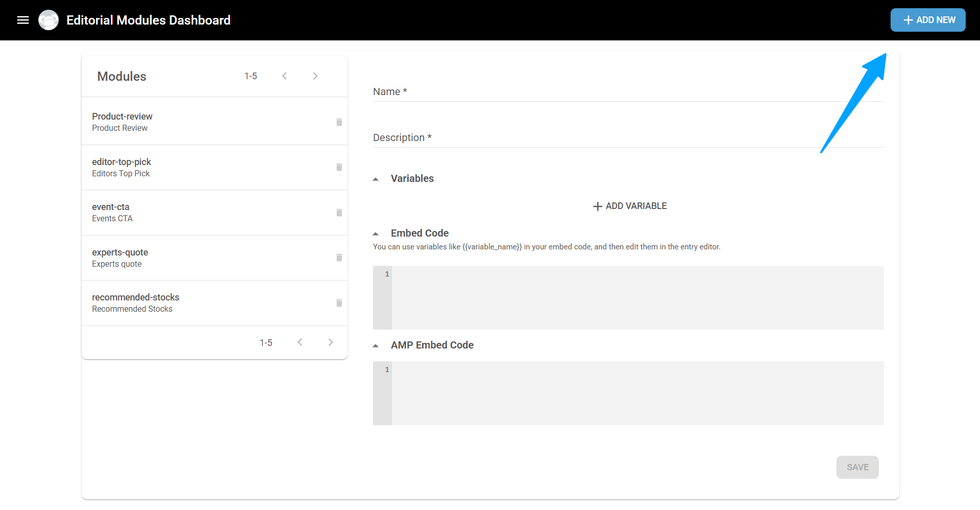 Go to the Editorial Modules Dashboard (formerly called Shortcodes) and click on the +Add New button at the top right corner.