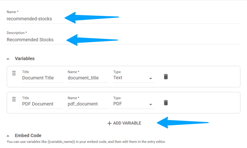 Then within Embed Code the searchable’s var keys can be used in the following format {{variable_name_key_1}}. This is a combination of the variable name defined in the dashboard and the key name. Example: Let's say the variable name is “country” and the field value is “code” in the variable, then you can use {{country_code}}.