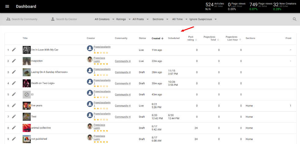We've added a new column to our customized posts Dashboard that's tailored for sites that are community enabled. Now administrators can see when drafts are scheduled to go live in one screen.