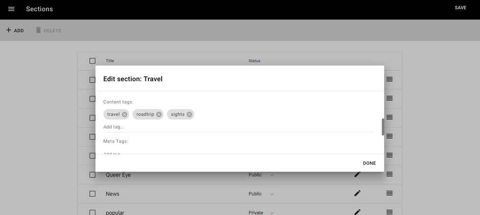 In the example below, we've added the tags "travel," "roadtrip," and "sights" to the "Travel" section. When a user selects the "Travel" section in the Entry Editor for the post being worked on, they'll get a pop-up notification asking them if they want to add those tags to the post.