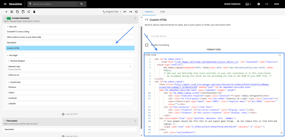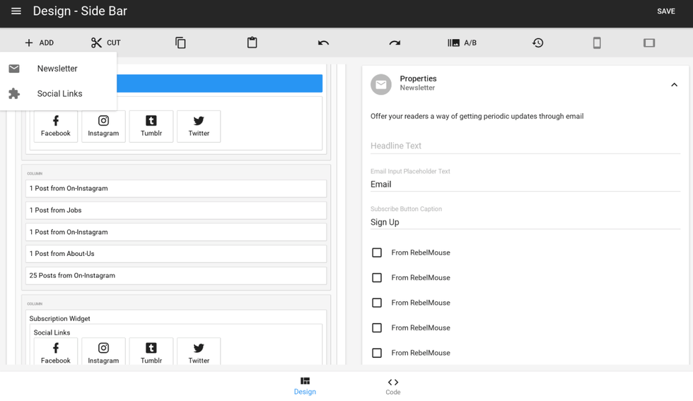 You can also copy newsletter codes for groups and drop them into RebelMouse as a custom HTML element. However, it will also be needed to have style sheets and CSS created for this code as well. Usually, all the needed style is already added to the copied code the Newsletter provider sends you.