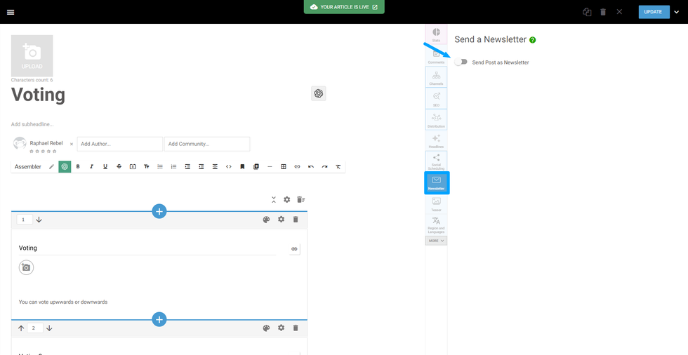 Important: If you are creating a new post that has yet to be published and you plan to send it as a newsletter, the Update & Resend Newsletter button will not be present.