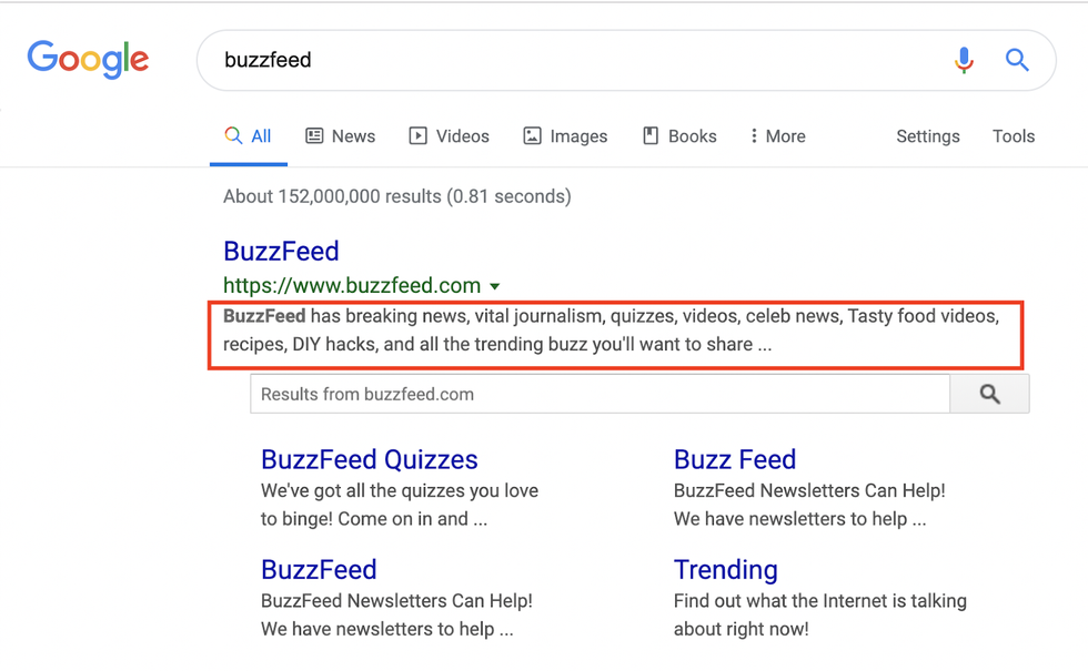 To increase your ranking on Google through user engagement with your content, it's important for your site to have a clear and concise metadata description. Also called "snippets," these organic pieces of text can help boost click-through rates to your pages. For example, here's what the metadata description is for the search query "BuzzFeed."