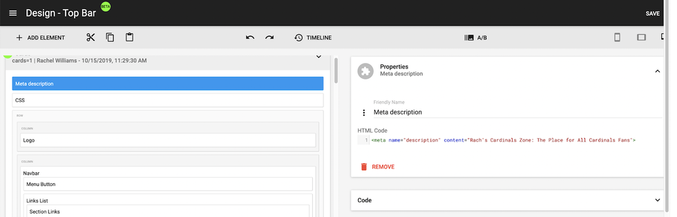 In the link above, Google provides several strategies for creating a link structure that will help the algorithm create effective search snippets, including writing relevant metadata descriptions. On RebelMouse, you can create your own metadata using Header Code elements in our Layout & Design tool. For example, adding the following Custom HTML element will add a meta description to your page: