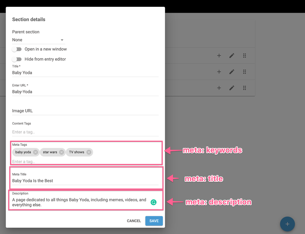When you're creating a new section for your site on RebelMouse, it's easy to add metadata at the same time. There are a few fields to fill out that will ensure Google has the information it needs.