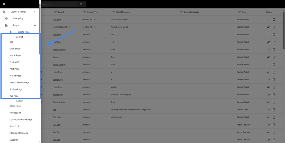 This option on the Hamburger menu shows all pages created on the site. They are divided into Default and Custom pages.