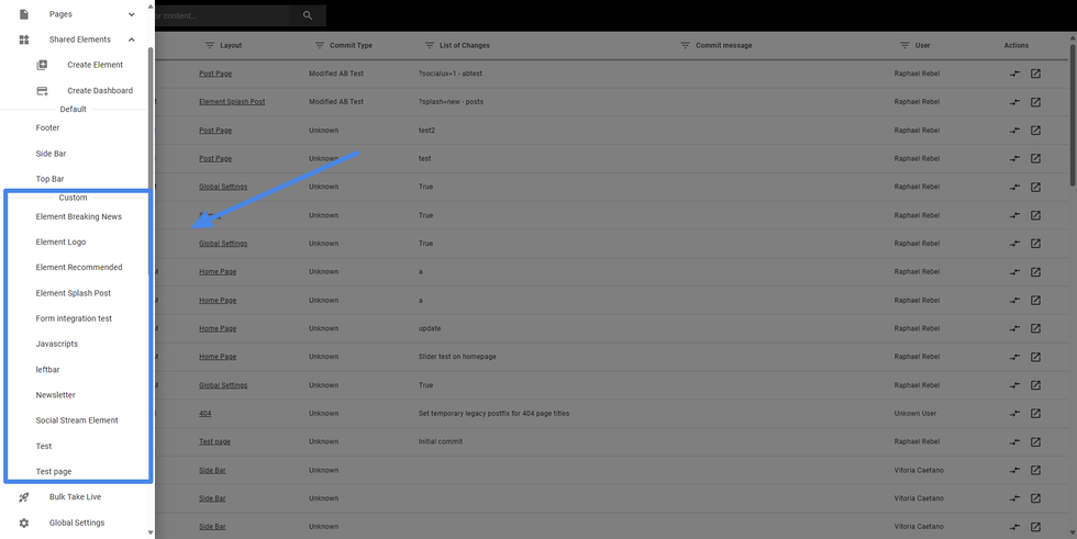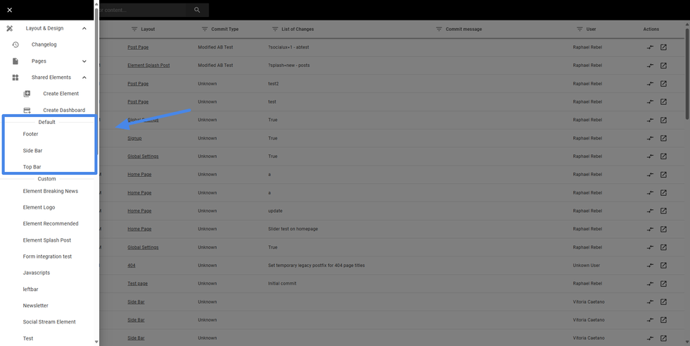 Similar to the Pages, the Shared Elements are specific elements that can be present in multiple parts of the site. They are also divided into Default and Custom.