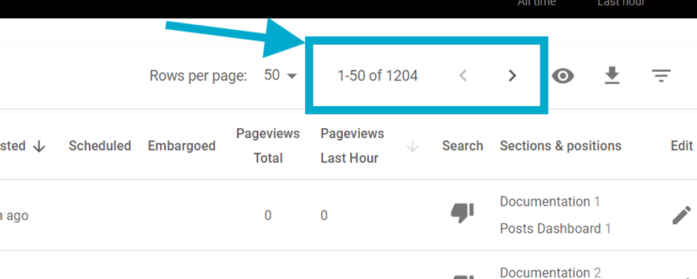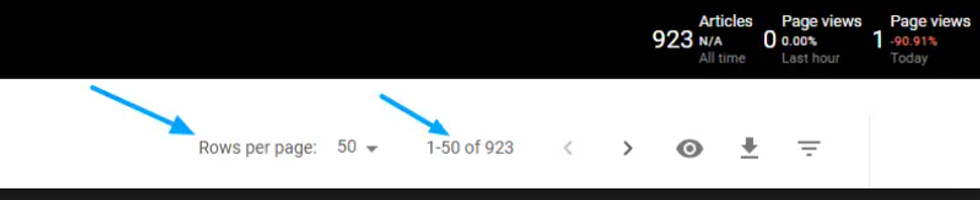 At the top of the table, you will find the Rows per page option. By default. It will be set at 50, which means that, on each page in the Posts Dashboard, there will be shown 50 posts. You can set other amounts by clicking in the dropdown near the number.