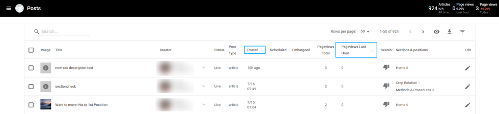 Some columns in the Posts Dashboard can be used as a reference to sort your posts. Those columns are Posted and Pageviews Last Hour.