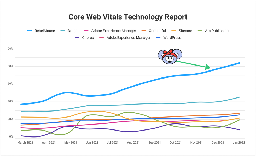 RebelMouse said goodbye to 2021 with a celebration of our commitment to powering the fastest sites on the web. Our prioritization of user experience and page speed allowed us to outperform our competitors on Core Web Vitals the entire year, and we’ve got the data to prove it. Check out HTTP Archive’s Core Web Vitals Technology Report for 2021 into January 2022:
