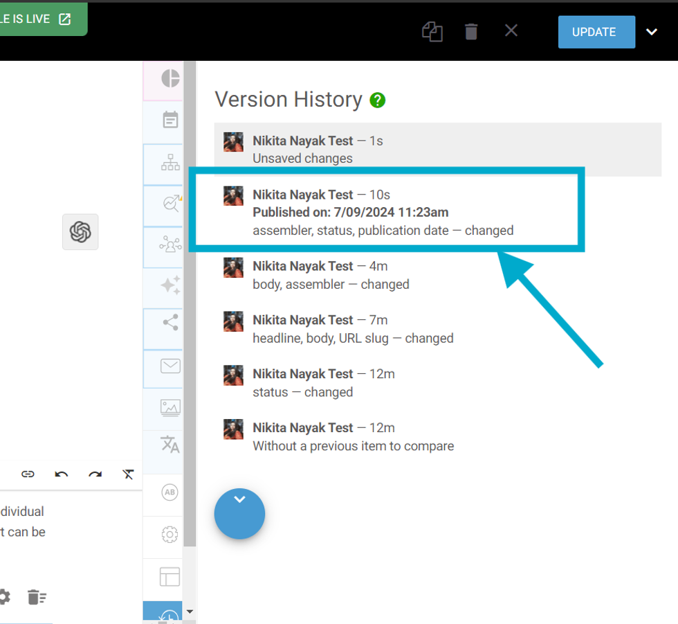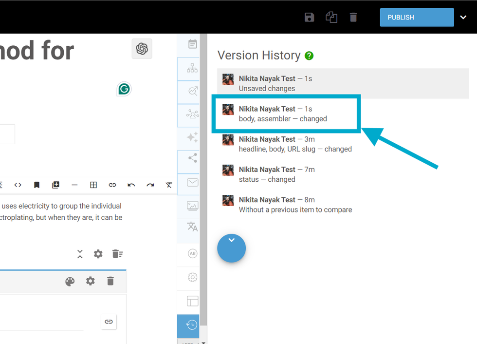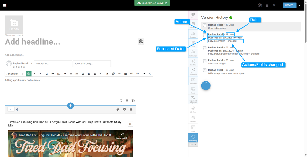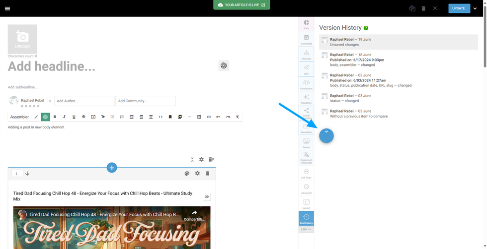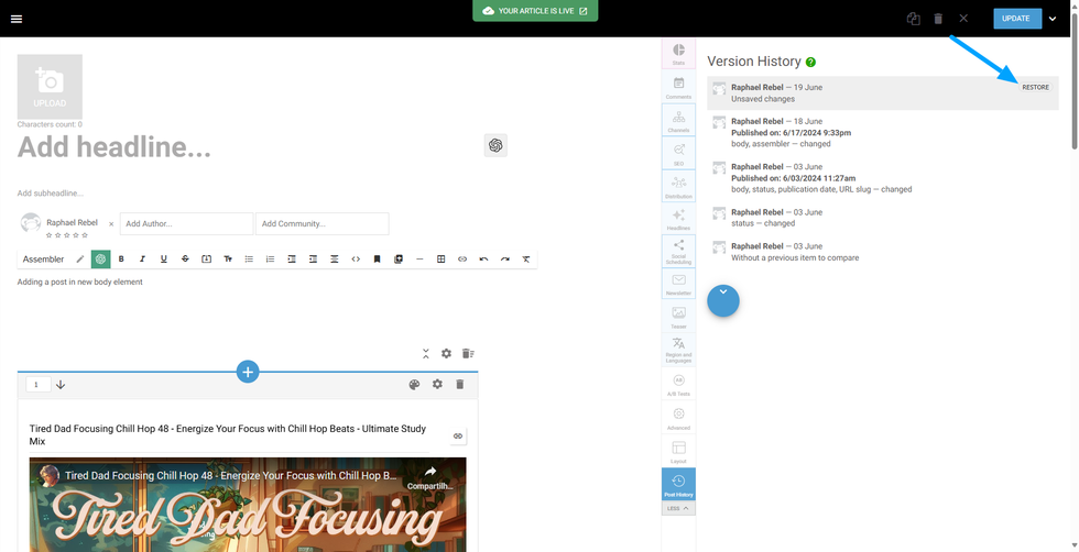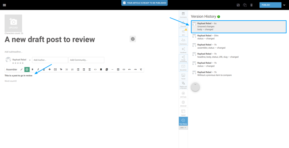 Using the Version History tab, you can easily view your post's last ten saved iterations and revert back. To access it, once logged into the Entry Editor, you can go to the Post History tab, at the right rail of the screen.
