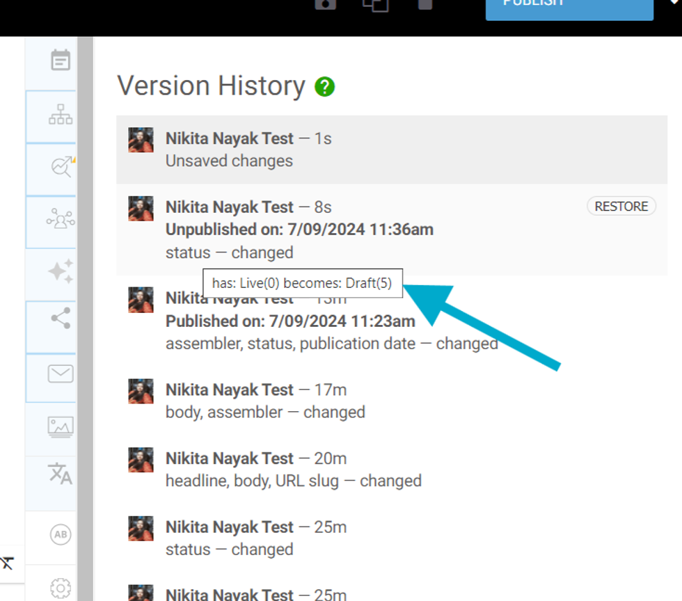 When you hover over the list item, you will see a Restore button. If you made any unwanted changes or want to get a previous version of the post, you can click on the Restore button and update your post.